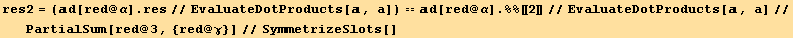 Print[" which gives:"]; res1=%//EvaluateDotProducts[e, g]